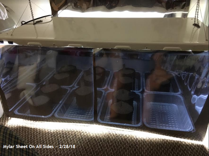 The last addition for now is mylar material to cover the front. Lots of exposure to Eye Hortilux bulbs is not good and was beginning to blur my vision. I halved the 4ft length so it could easily be lifted up for maintenance.