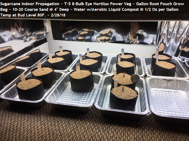 An inch of water should be maintained in the bottom of the tank after what is visible is wicked up, which keeps the top inch of sand damp while providing air circulation needed to keep healthy liquid compost microorganisms alive and aerobic. Light is set for 16 hours on, 8 hours off. No more liquid compost will need to be added for awhile and I fully expect to need bringing out the T-5 light fixture before long and re-potting sugarcane starts!