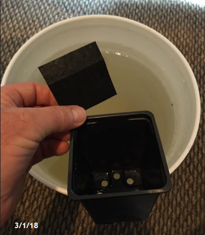 The sand barrier is fitted into the pot, about a cup of sand is added and the pot is then lowered into the bucket of water which has 1/2 oz per gallon of Aerobic Liquid Compost. When the sand is saturated, the pot is lifted out and allowed to drain back into the bucket. This inoculates the sand with beneficial compost microbes and nutrients so the cuttings will have a good start and will remain plenty damp until they arrive.